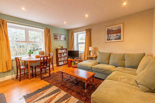 The cosy sitting/dining room is furnished with a large corner sofa, dining table, and a TV with DVD.There are also lots of books, maps, and games that you are welcome to use. The room looks north and east towards Scotland and the Lorton Fells. There are often sheep grazing immediately behind the cottage.