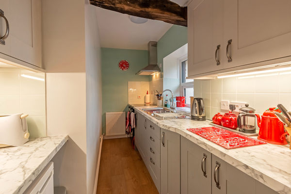 A door leads from the sitting room into the galley kitchen. The kitchen has recently been completely upgraded. It is well-equipped with an electric cooker, microwave, slow cooker, food processor, fridge, and all the pots, pans & utensils you could need. Additionally there are laundry facilities in the basement below the cottage, and a large chest freezer for guests to use, accessible from the exterior.