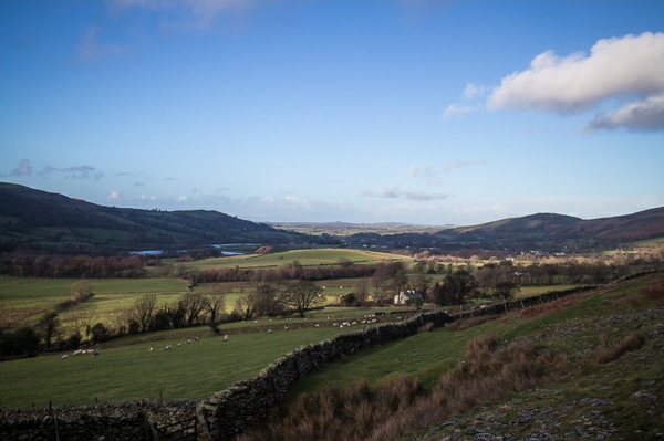 Leave High Swinside from the cattlegrid and walk south on the track then the road along the valley side with fine views ahead and across the valley. This photo is taken looking back northwards towards the Solway plain.