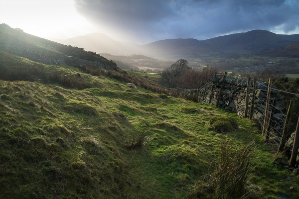 Take the first footpath on the left which comes near a parking place and shortly before the gate across the road. Where the path divides, keep right so that you stay near the wall on your right. You cross Hope Beck and will soon be walking along the side of the Dodd with it rising steeply on your left.