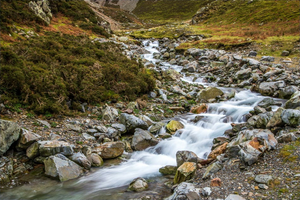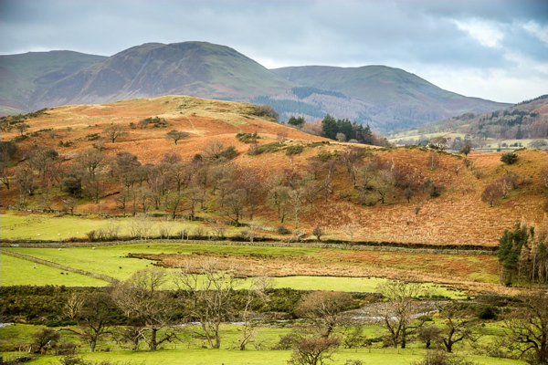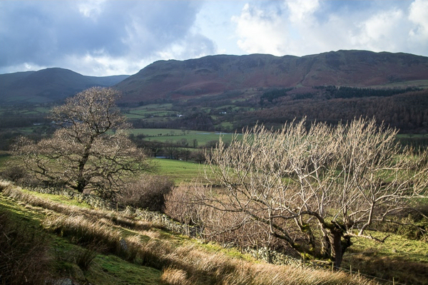 Liza Beck cuts down the impressive Gasgale Gill valley. There is a footbridge here (damaged by storm Desmond, so if not yet repaired you might have to use stepping stones a little higher up the stream). Cross the stream then take the path downhill to the road and Lanthwaite Farm.