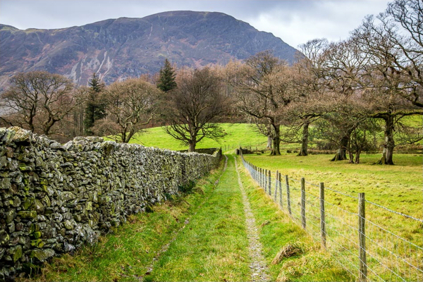Cross another footbridge, this time over Park Beck carrying the outflow from Loweswater, and just before the shore bulges out into the lake, turn right along a path away from the water. Almost immediately, turn right again and shortly you will recross Park Beck as you now head towards Muncaster House. (This photo is looking back towards Crummock Water along that track).