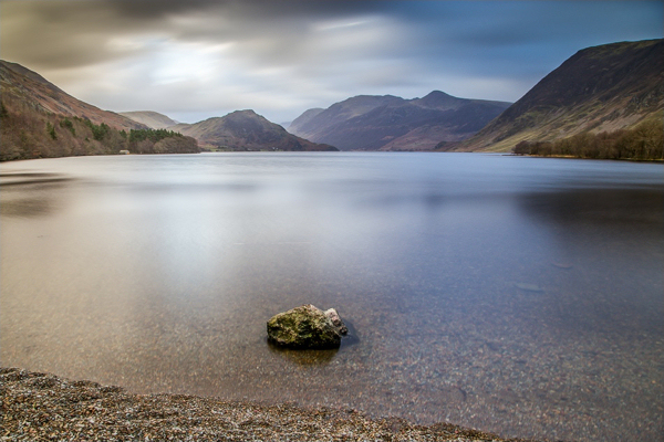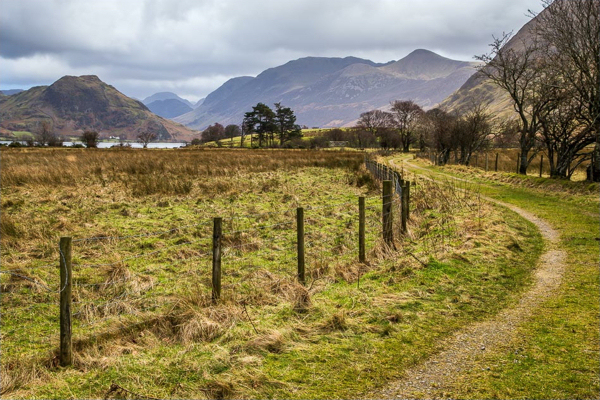 Keep next to the shore as it curves around and cross the footbridge at the weir where the River Cocker exits the lake. The view up the lake from here is stunning with Rannerdale Knotts on the left, Melbreak to the right, and the High Stile range in the distance beyond...