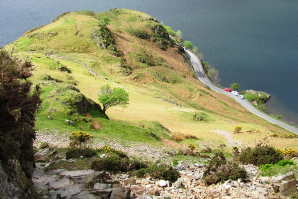 Looking off to the left you will sometimes be able to look down into Rannerdale below and what will be your descending path. In May there will be a haze of bluebells on the slopes below.