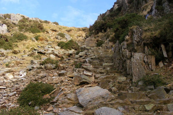 (You can see the saddle in this photo looking down from above). Just beyond the saddle there is a choice of paths. Ignore the one going straight ahead, and instead keep left and uphill, then left again onto a recently rebuilt path which is stepped for quite a distance up through a gap in the crags. This is the steepest section of this route, but the views whenever you stop for a breather are astounding!