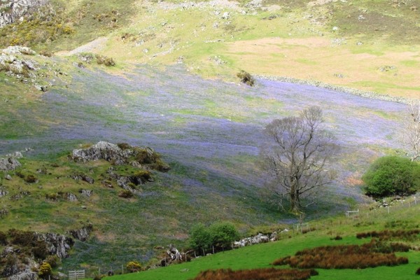 Depending on which side of the beck your path has taken you may need to cross the footbridge near the foot of the crags to get back to you car (past this boulder and through a gate beside a wall). If instead, you parked at Lanthwaite Green car park, you would keep to the right of the stream and continue ahead till your path regains the B5289 and so back to your car park. Alternatively, you can cross the road to walk back along the Crummock Water shore and through the woods. This stunning bluebell photo is by Andrew Locking, and you can see many more photos of this walk on his excellent walks website: in January, or in May. |